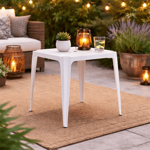 Mesa cuadrada de PVC blanca, liviana y resistente. Ideal para exteriores, patios y eventos. Fácil de limpiar, práctica y funcional.